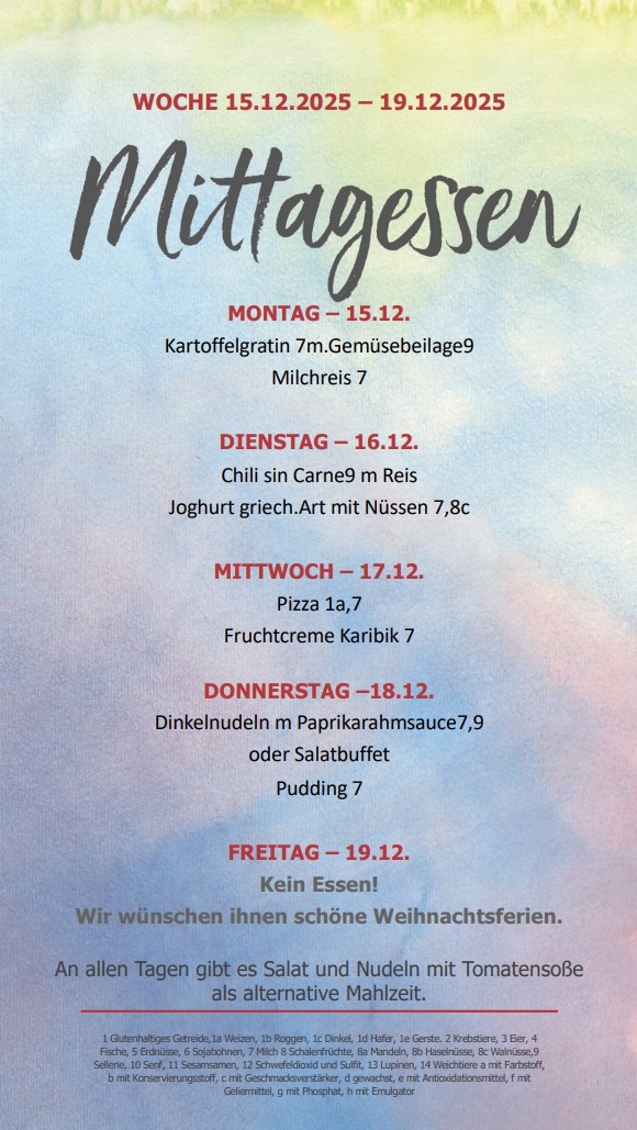 An allen Schultagen werden zwei Mittagsgerichte, Salat und ein Dessert angeboten. Außerdem gibt es in der Großen Pause belegte Brötchen und Brezeln.